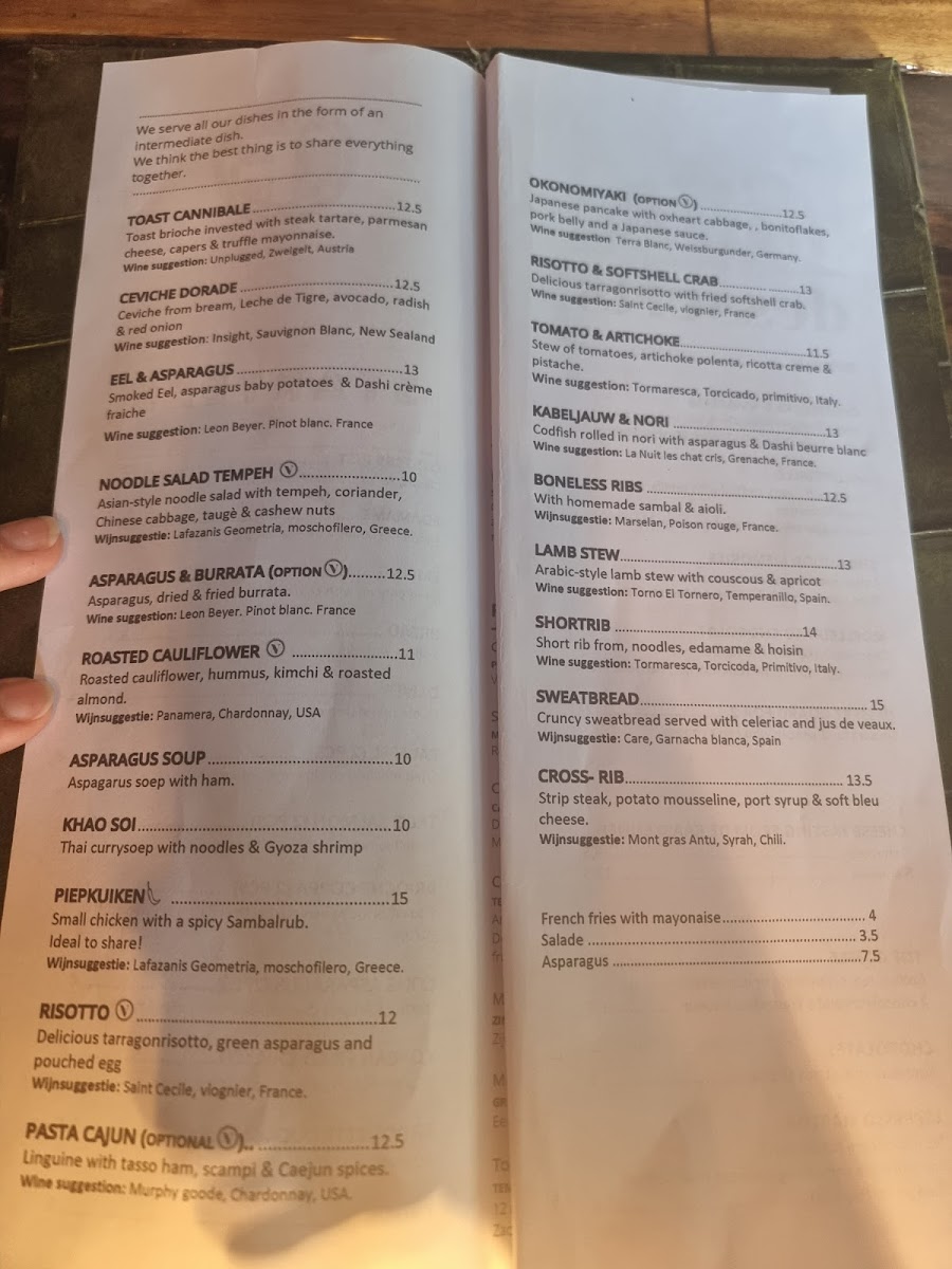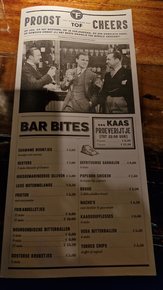 Viewed through the lens of a reviewer, the menu at Gastrobar Tof feels like a carefully curated balance between comfort food and creative international inspiration. The selection encourages sharing and exploration, starting with approachable bites such as Fingerfood and Brood Look & Saus, which set a relaxed tone and prepare the palate for bolder flavors. Starters like Garnalenkroketjes and Cevice Vis Gegaard In Zuur highlight the kitchen’s confidence with seafood, offering freshness and contrast, while Asperges bring a seasonal, refined touch.